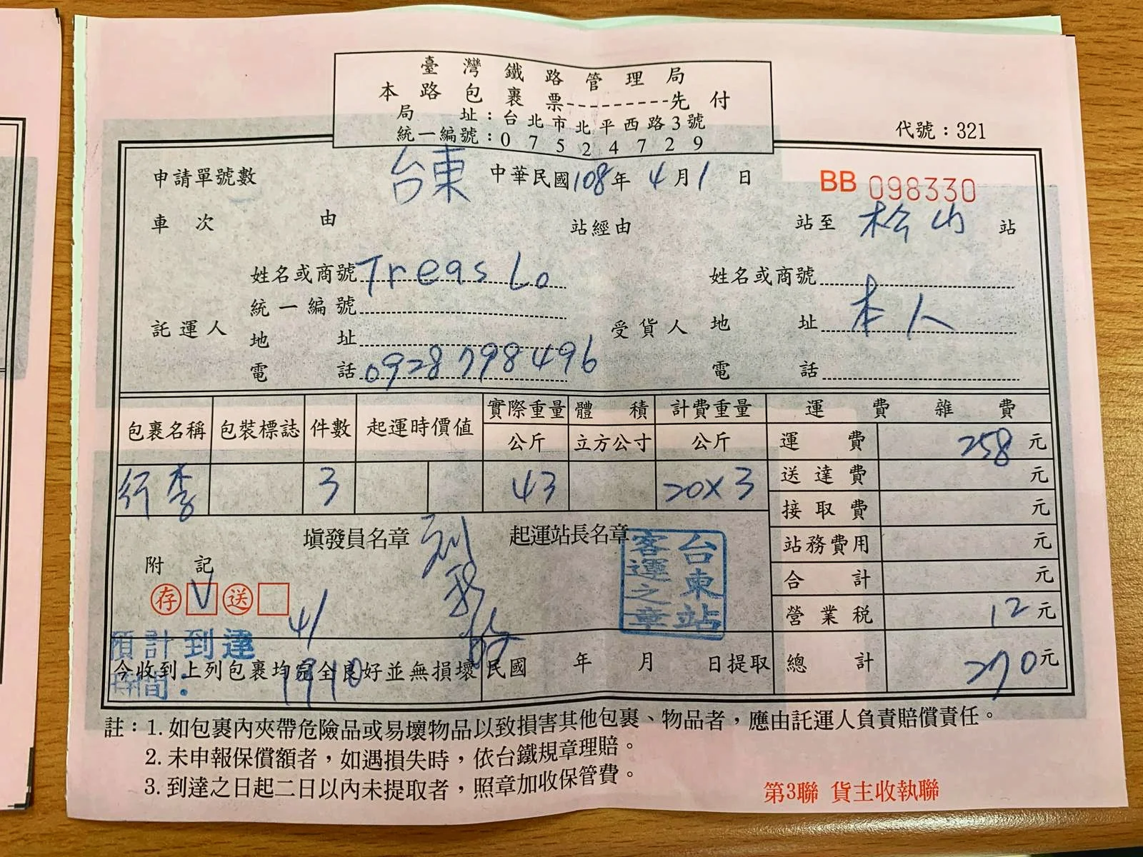 Thanks to the help from the owner of the inn we stayed at in Taitung, we were given very accurate information about how to forward our bike luggage. Basically, each major train station has a cargo freight service that can send bulk items to any designated station in the country.